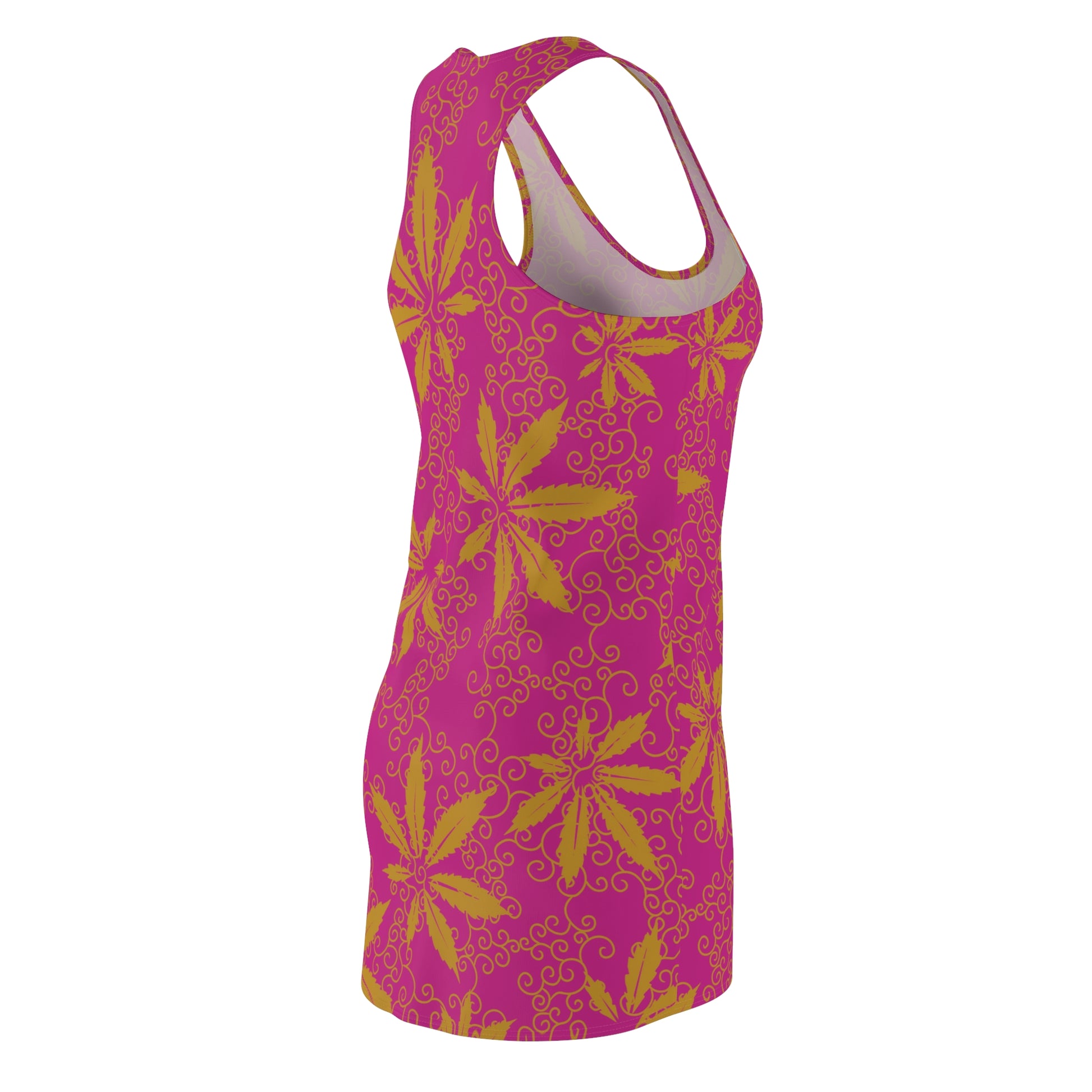 Cannabis Racerback Kleid Damen – Pink Gold Sommerkleid mit Hanfblättern