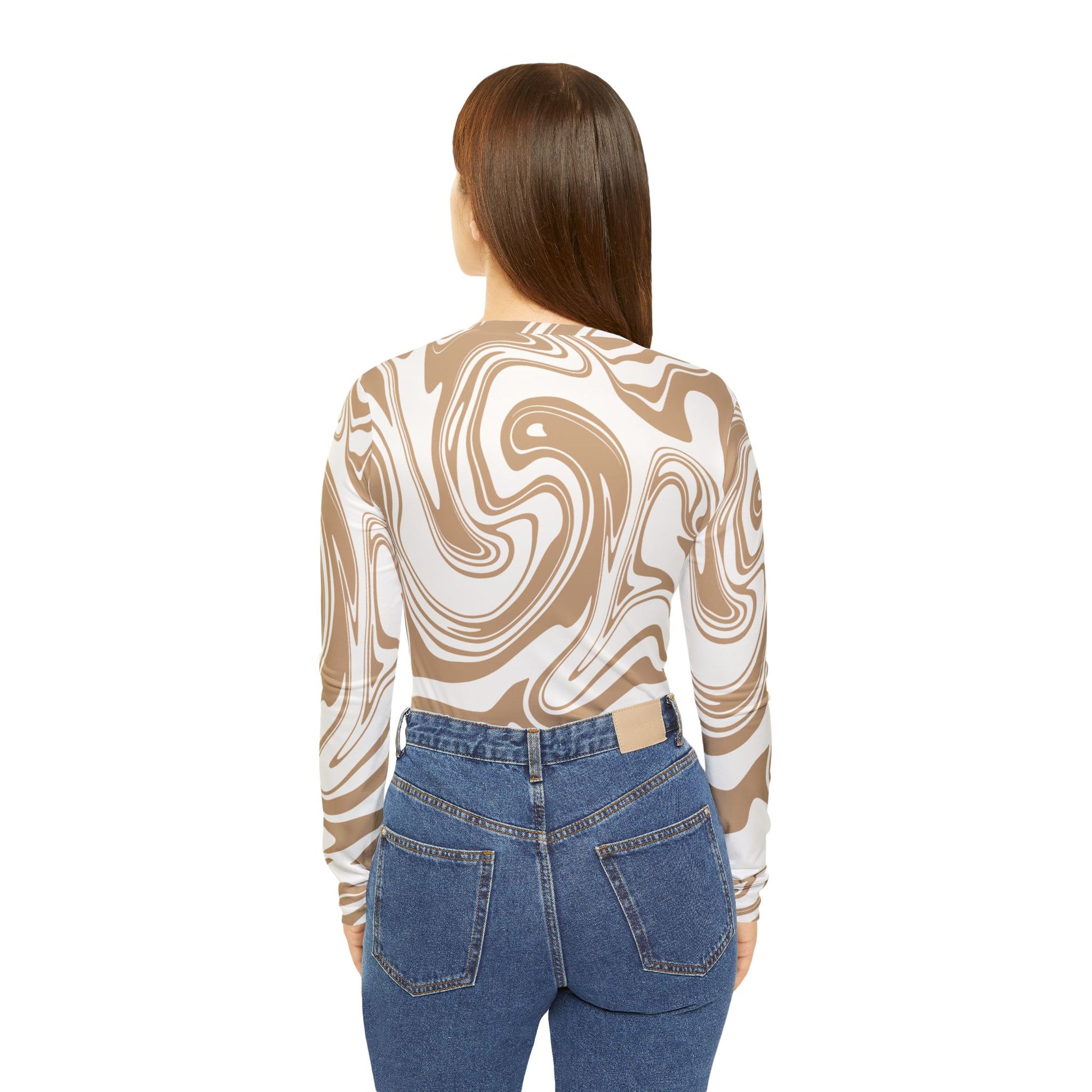 Damen Langarm V-Neck Shirt – Modernes Swirl-Design in Beige & Weiß, Stylisch & Bequem