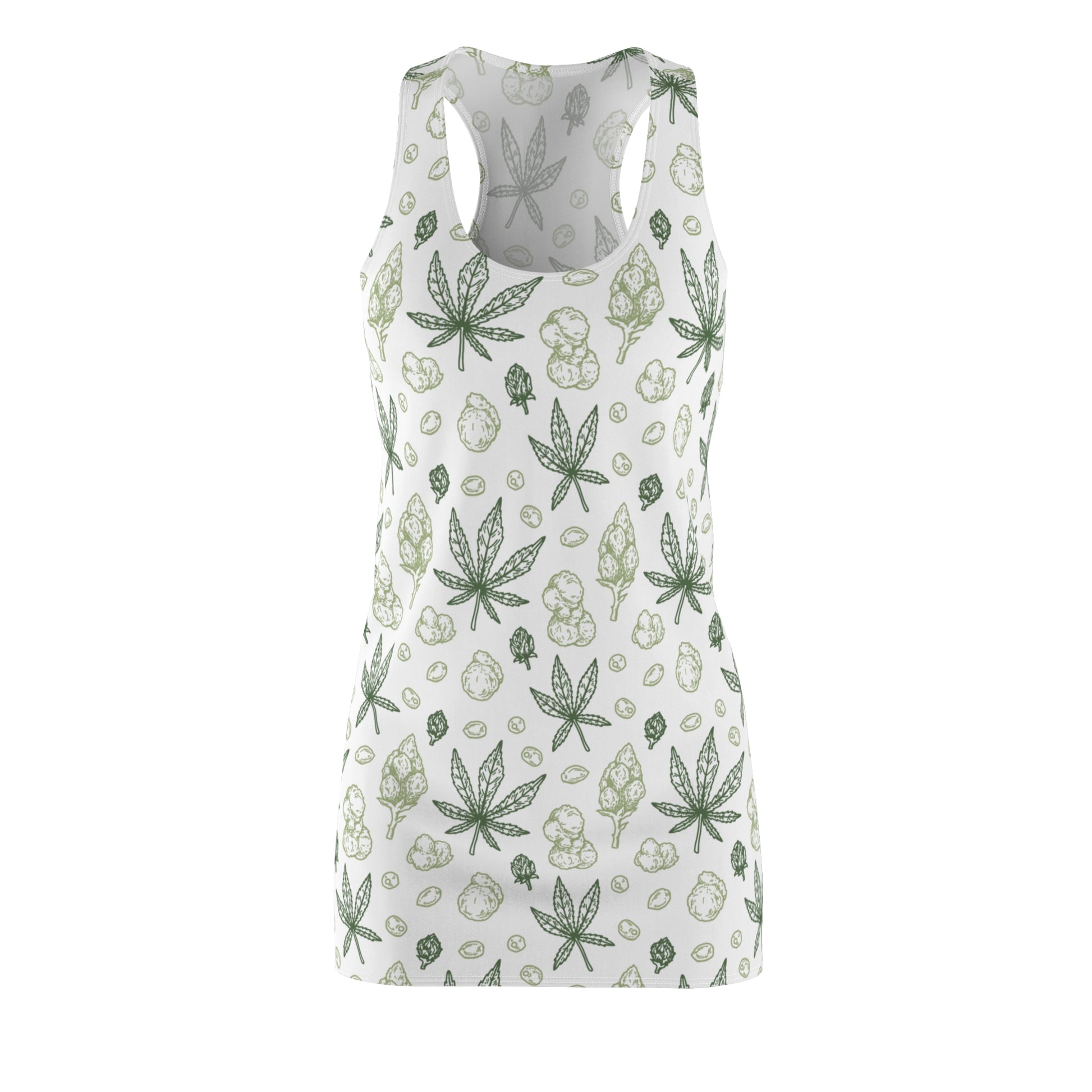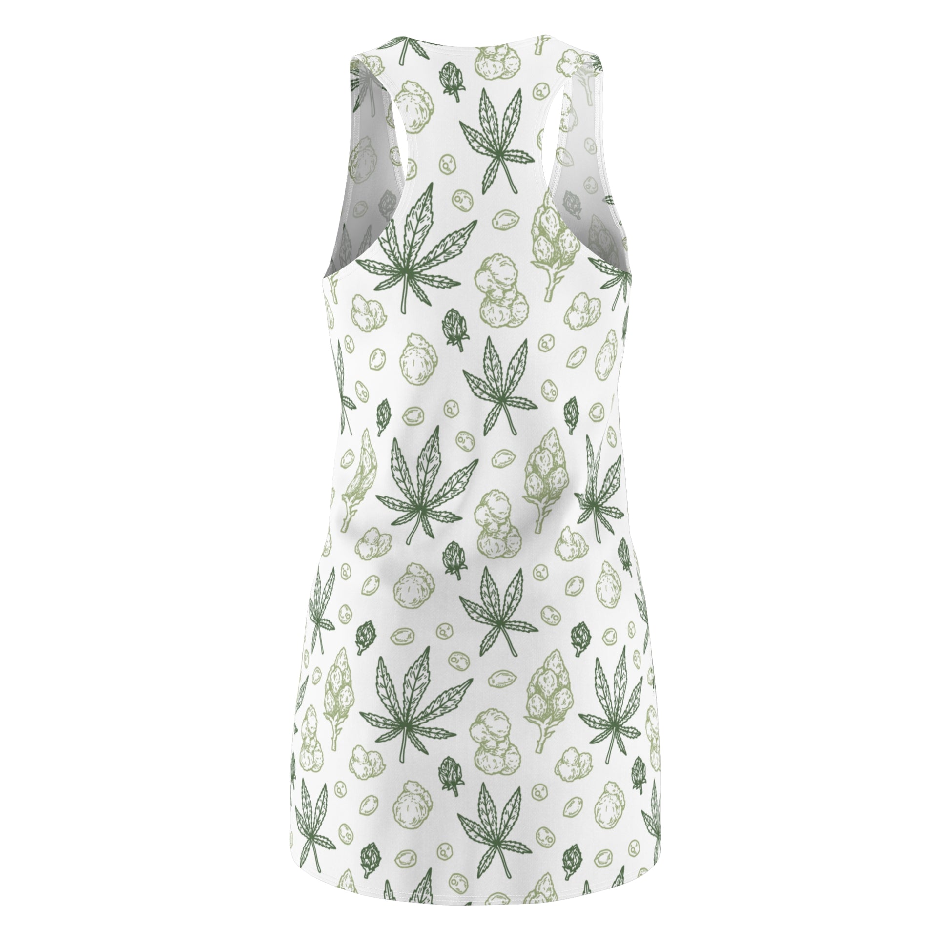 Damen Racerback Kleid Weiß Grün mit Cannabis Blättern – Sommerkleid