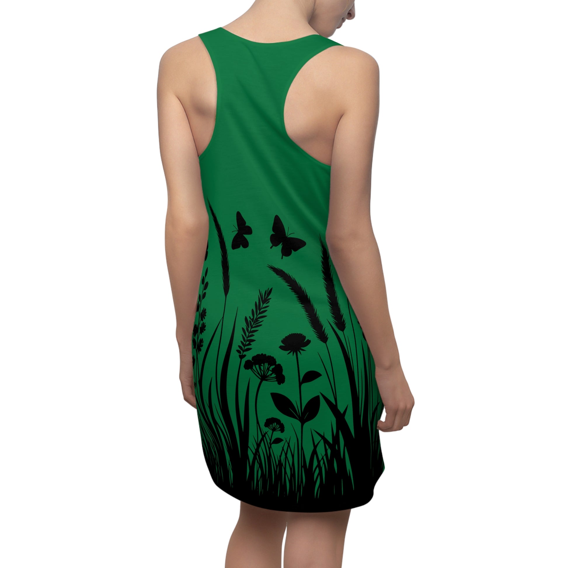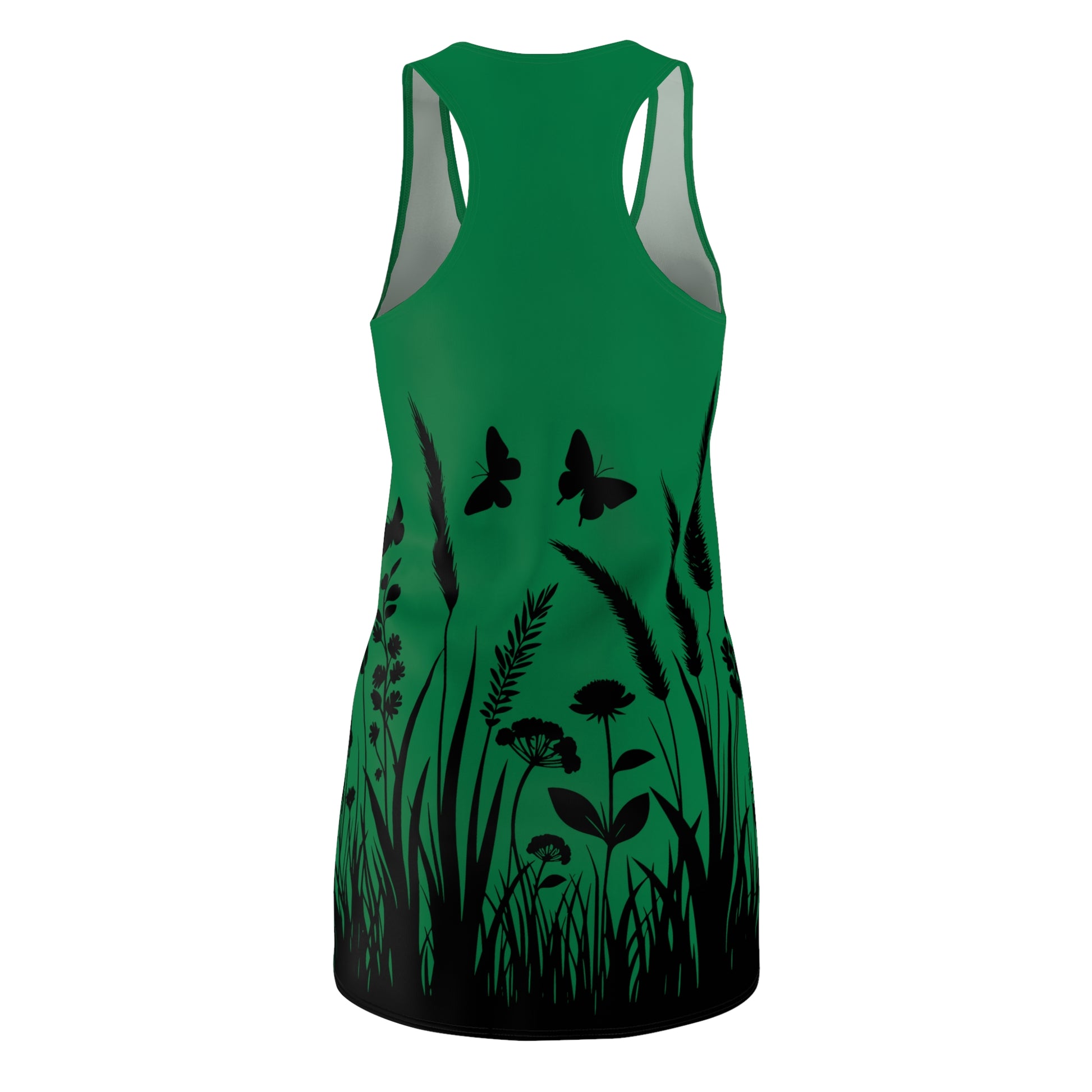 Dunkelgrünes Naturmuster Racerback Kleid – Schmetterling & Blumen Design