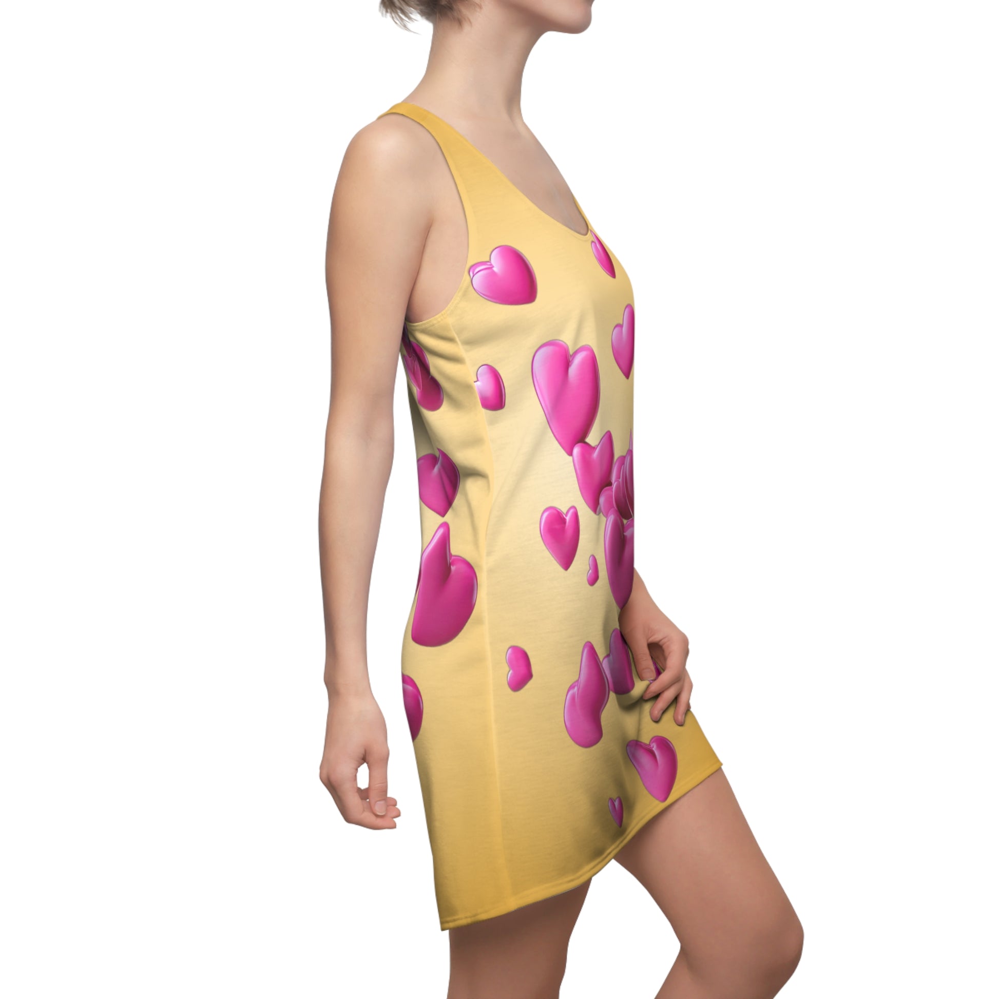 Goldgelbes Racerback Kleid mit pinken 3D Herzen – Farbverlauf