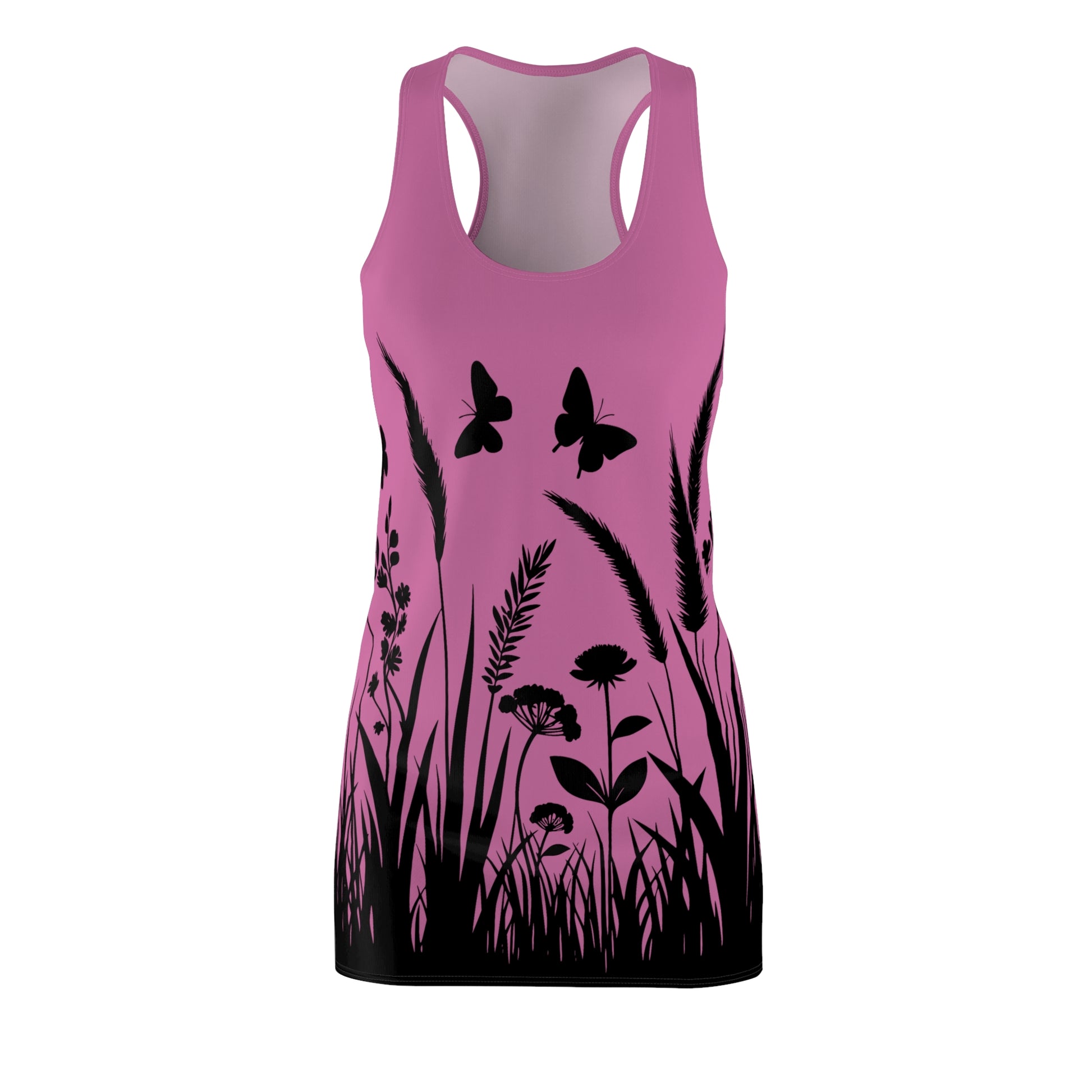 Rosanes Naturmuster Racerback Kleid – Schmetterling & Blumen Design