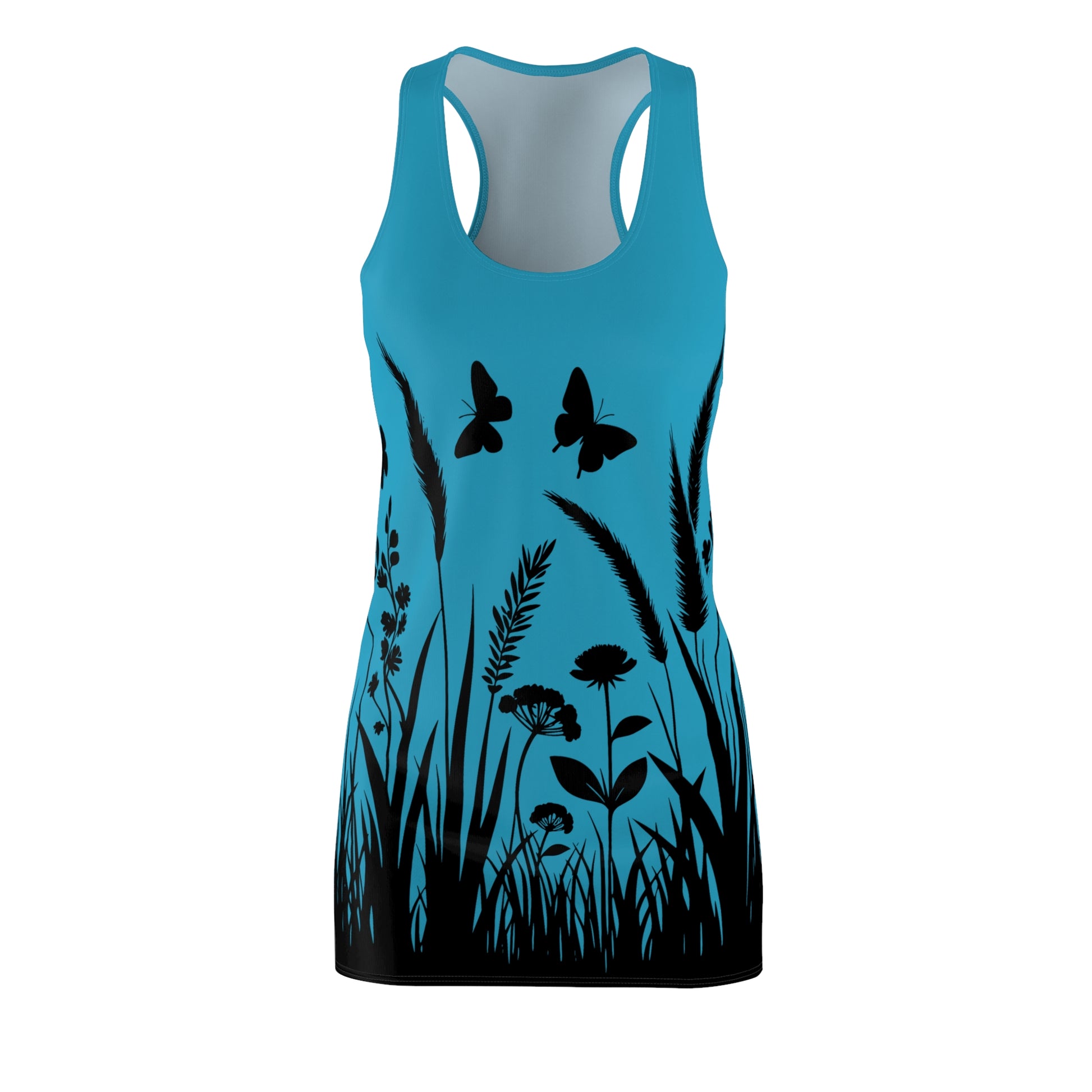 Türkises Naturmuster Racerback Kleid – Schmetterling & Blumen Design