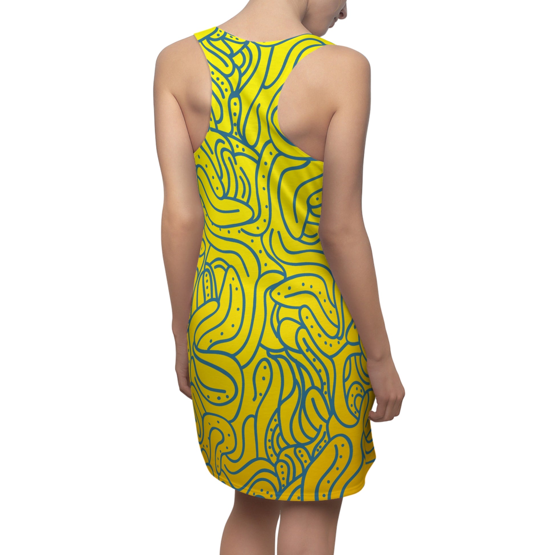 Vibrant Yellow Abstract Print Racerback Dress | Summer Beach Dress | Women’s Sleeveless Casual Dress | Trendy Party Outfit | Bold Graphic Fashion Dress